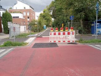 An der Kreuzung von Hoesch-Hafenbahn-Weg überrascht kurz nach der Fertigstellung die erste Aufgrabung. Auf Nachfrage von VeloCityRuhr.Net teilt der RVR mit: Aus bautechnischen und verkehrssicherheitsrelevanten Gründen mussten die Asphaltarbeiten an einer Stelle der Kreuzung „Im Defdahl“ nachgebessert werden. Die Fläche wird anschließend wieder rot markiert.